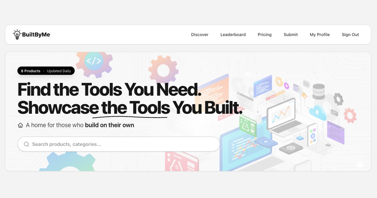 BuiltByMe is an indie maker directory where solo founders and small teams launch, showcase, and grow their products through weekly competitions, rankings, and community-driven discovery.
