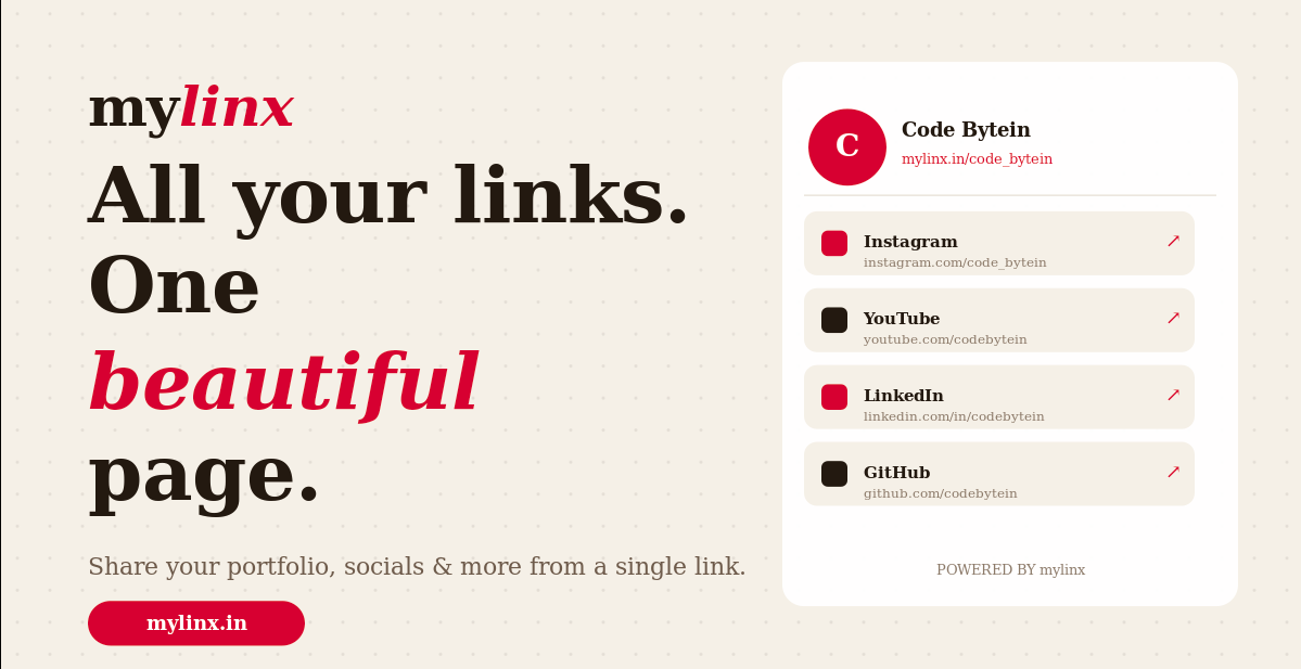 Create your free link-in-bio page in seconds. Share all your social links, track clicks, and customize themes. MyLinx is a community-focused, free alternative to Linktree designed for simplicity and speed.